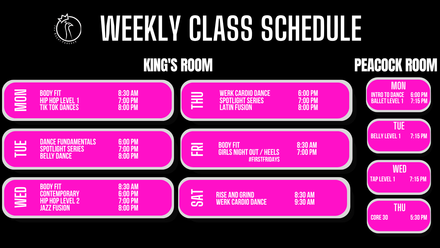 Need space for your dance rehearsal or to host your next dance class, workshop, meeting, party or special event? What about a space for your next photo or video shoot? Our spacious studio, also known as the King’s Room, is available for rent for any of your occasions. It comes with only the Royal treatment! How cool is that?
